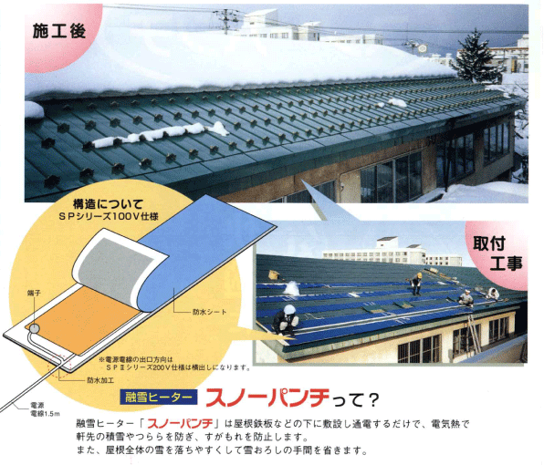 融雪ヒーターは屋根鉄板などの下に敷設し通電するだけで、電気熱で軒先の積雪やつららを防ぎ、